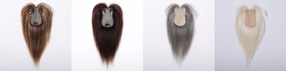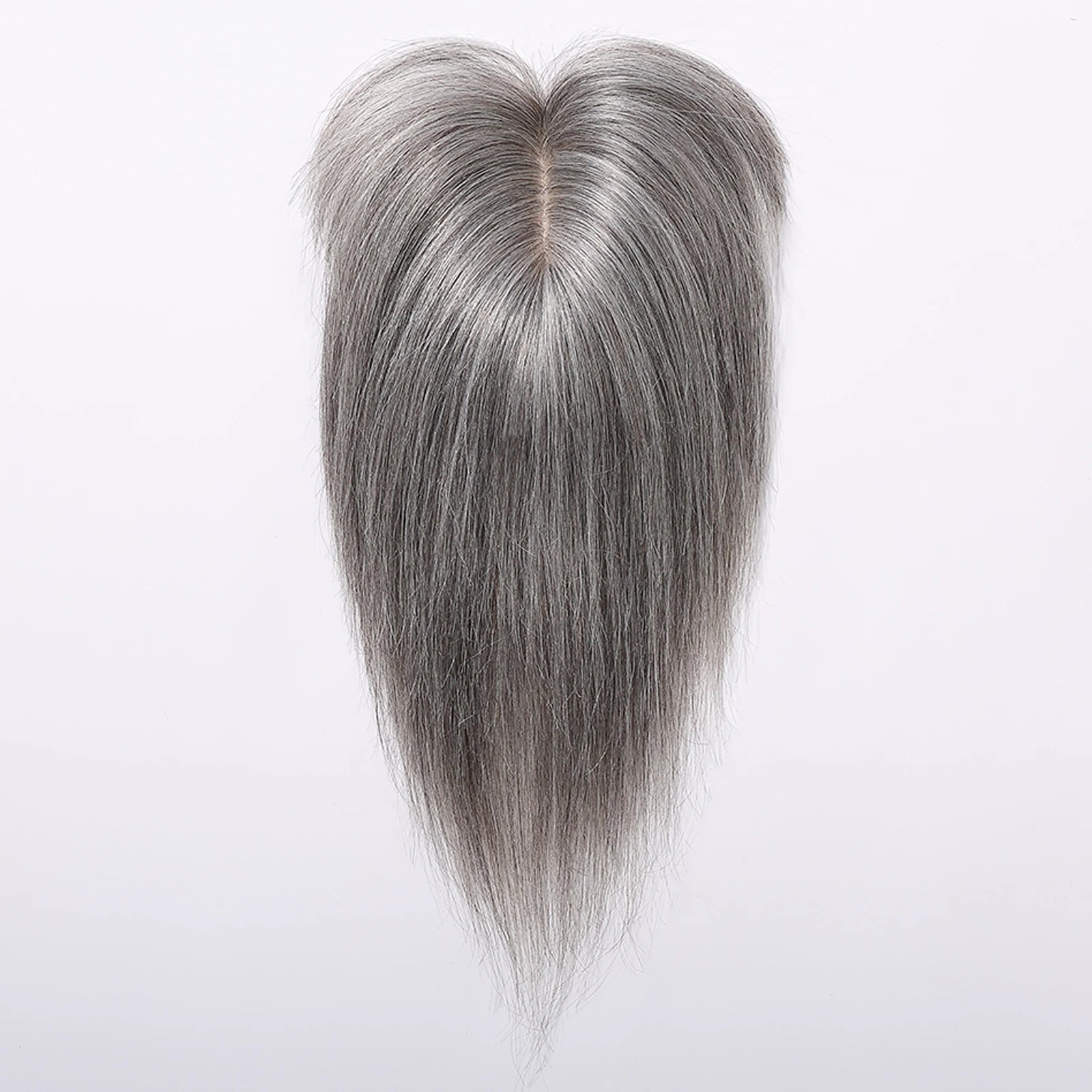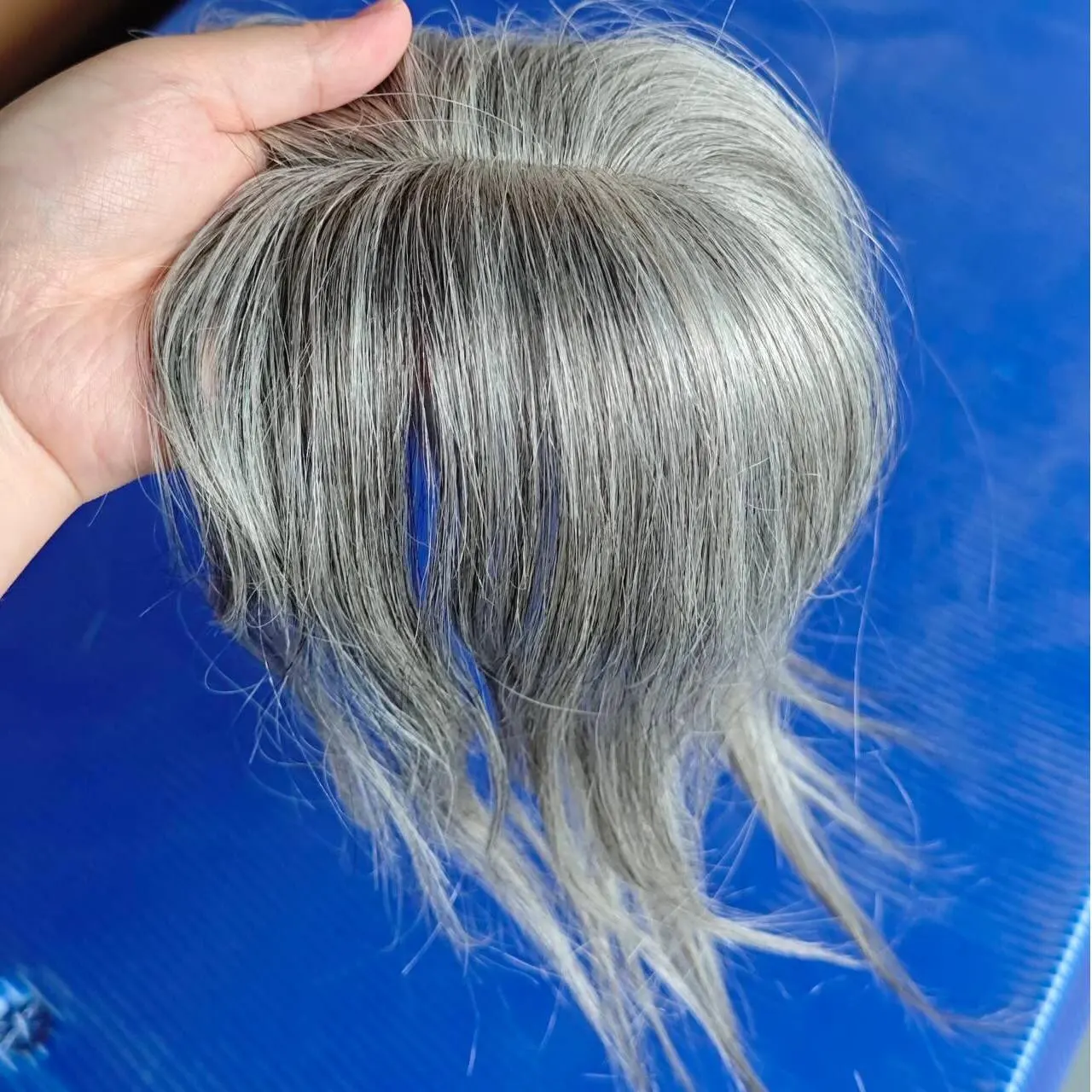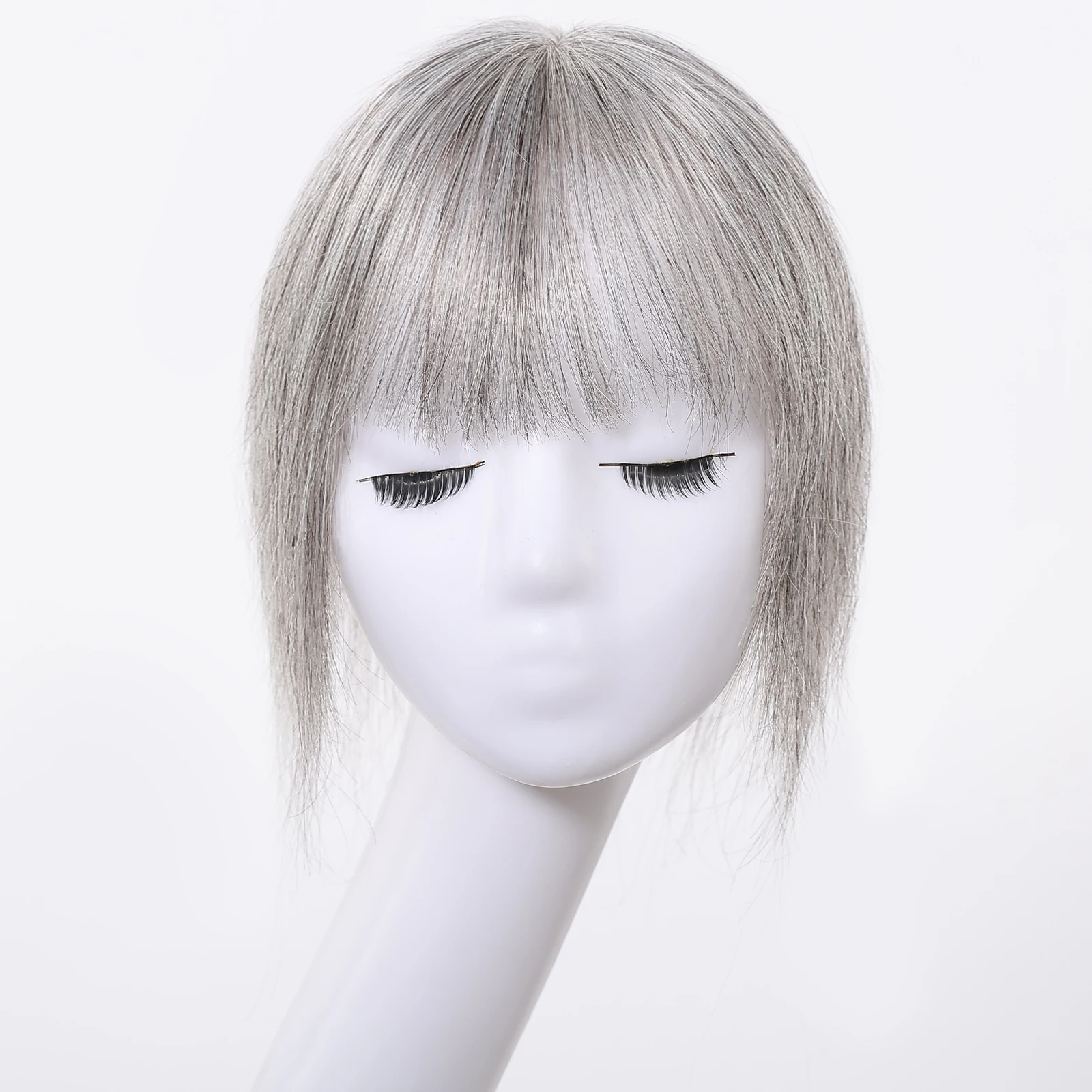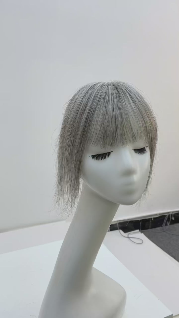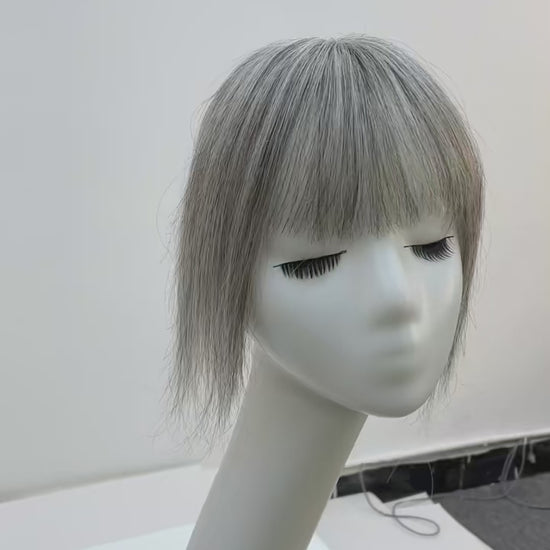Light Grey Human Hair Topper with Thick Bangs – 360° Clip-In Silk Base Topper for Women